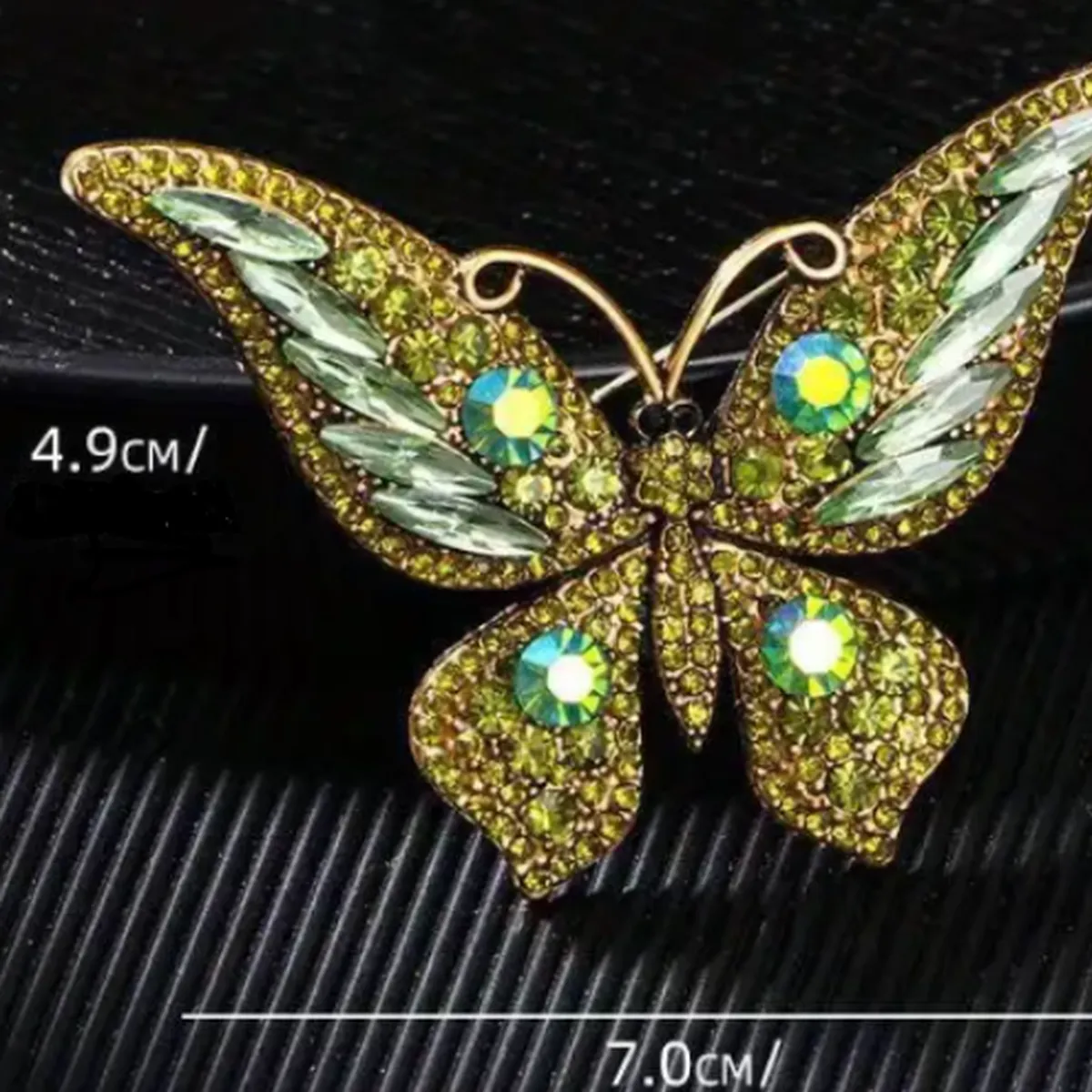 Broche de mariposa verde olivo con detalles brillantes.
