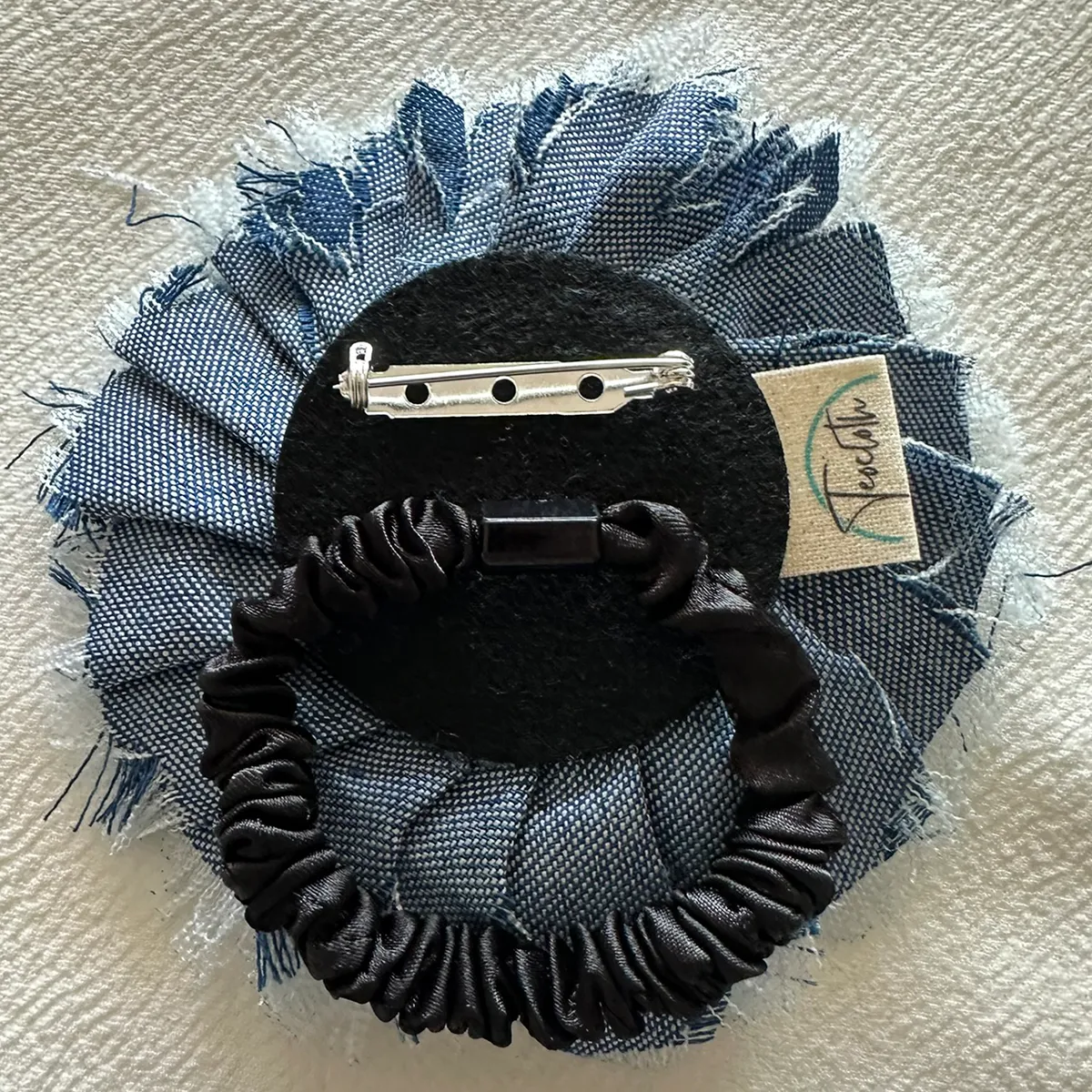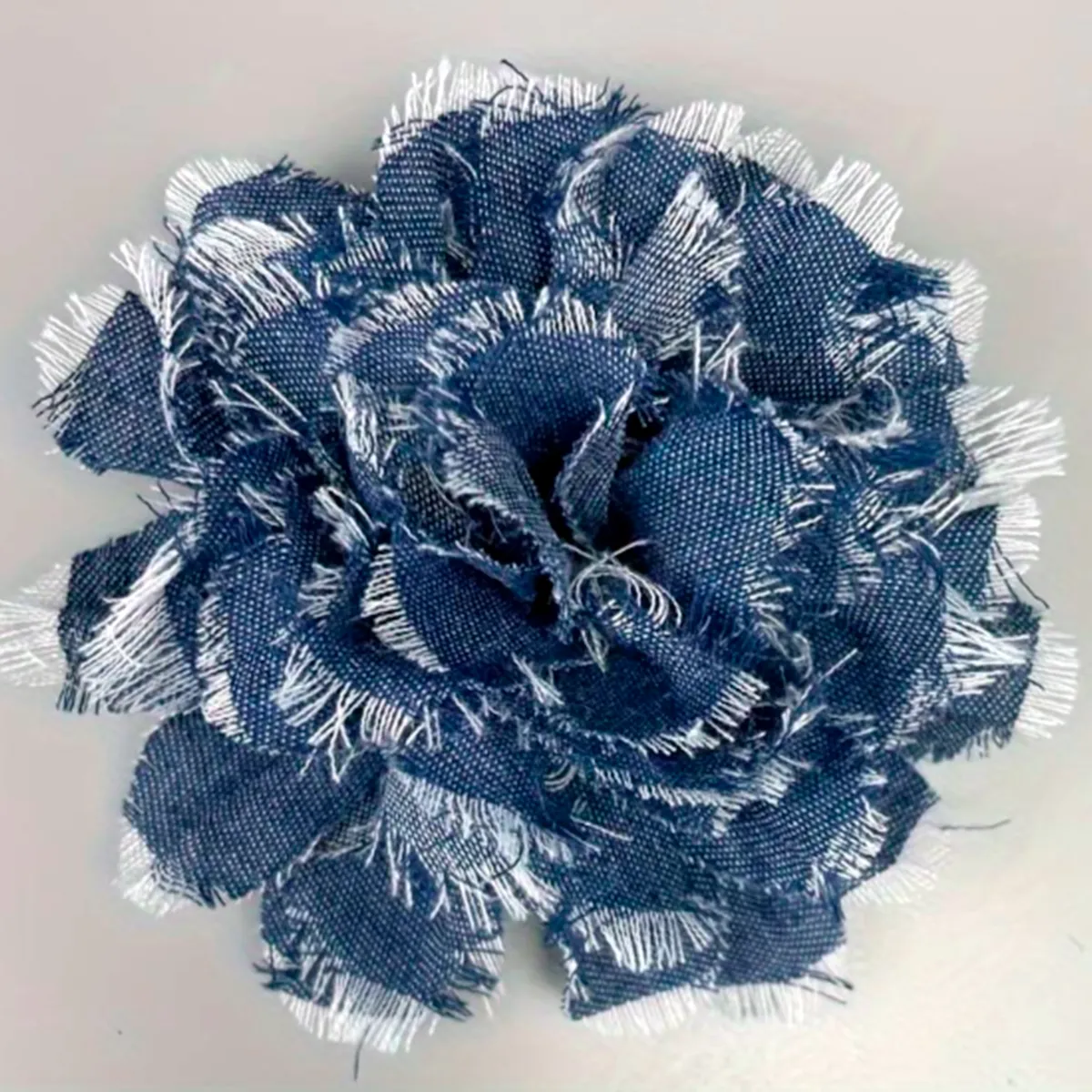Rosa elaborada en mezclilla desgastada con bordes desflecados para un look rústico. Medidas: 10 cm
